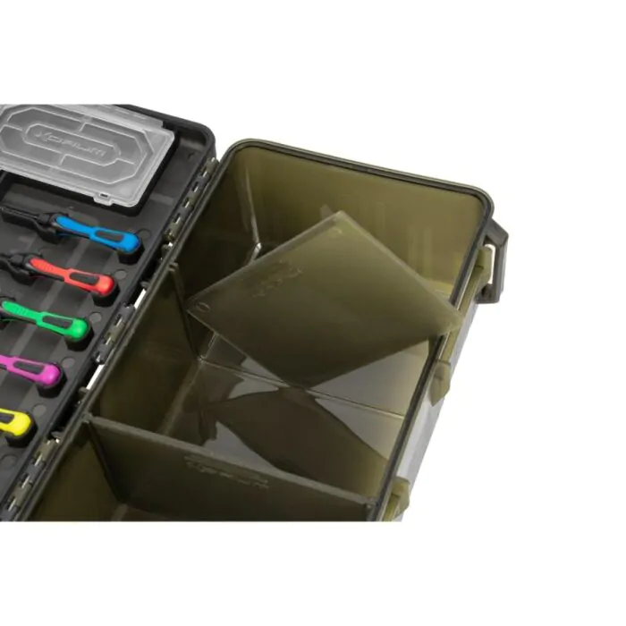 BLOX is een nieuw concept voor het opbergen van visspullen gericht op de allround visser. Ontworpen om alles wat je nodig hebt op één overzichtelijke plek op te bergen. We hebben de BLOX zorgvuldig op maat gemaakt om de belangrijkste items van end tackle op te bergen, zoals spoelen lijn, pakjes haken en accessoires. Je hebt de optie om de speciale BITS BLOX te gebruiken als je liever compartimenten hebt, maar je kunt ook terminal tackle in het deksel van de box opbergen. Je aasgereedschap klik je netjes op zijn plaats, terwijl je de hoofdbox met tussenschotten naar wens kunt aanpassen. Desgewenst kun je er ook je RIG BLOX in opbergen, zodat al je voorgebonden haaklengtes beschermd zijn tegen de elementen. Het is één doos die het allemaal doet!